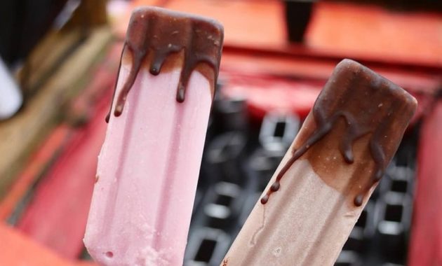 6. Keluarkan es dari cetakan lalu celupkan ke dalam lelehan coklat.